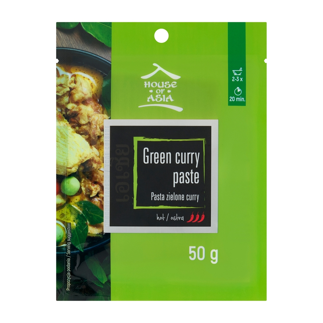 chili zielone 30 %, trawa cytrynowa 25 %, sól, czosnek, szalotka, galangal, skórka z limonki kaffir, kumin mielony.