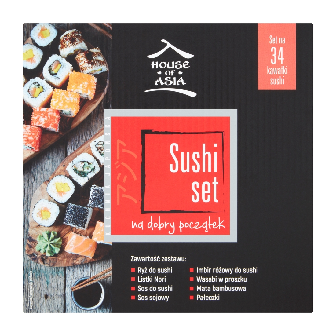 ryż do sushi 250 g, liście nori 9 g (4 listki), sos do sushi 30ml, sos sojowy 30 ml (3x10 ml), imbir różowy 20g (2x10 g), wasabi w proszku 12 g, mata bambusowa, pałeczki do sushi 2 pary